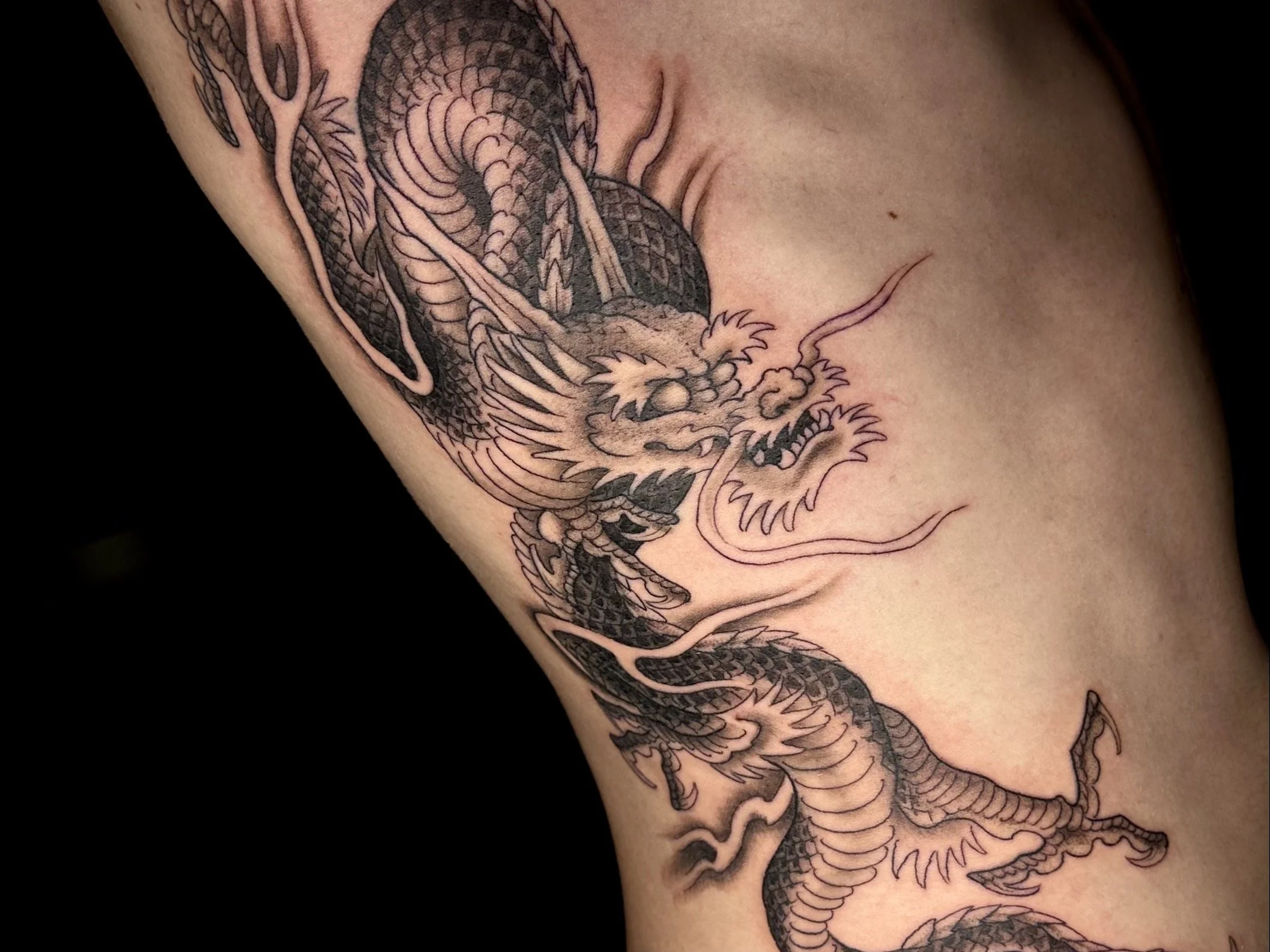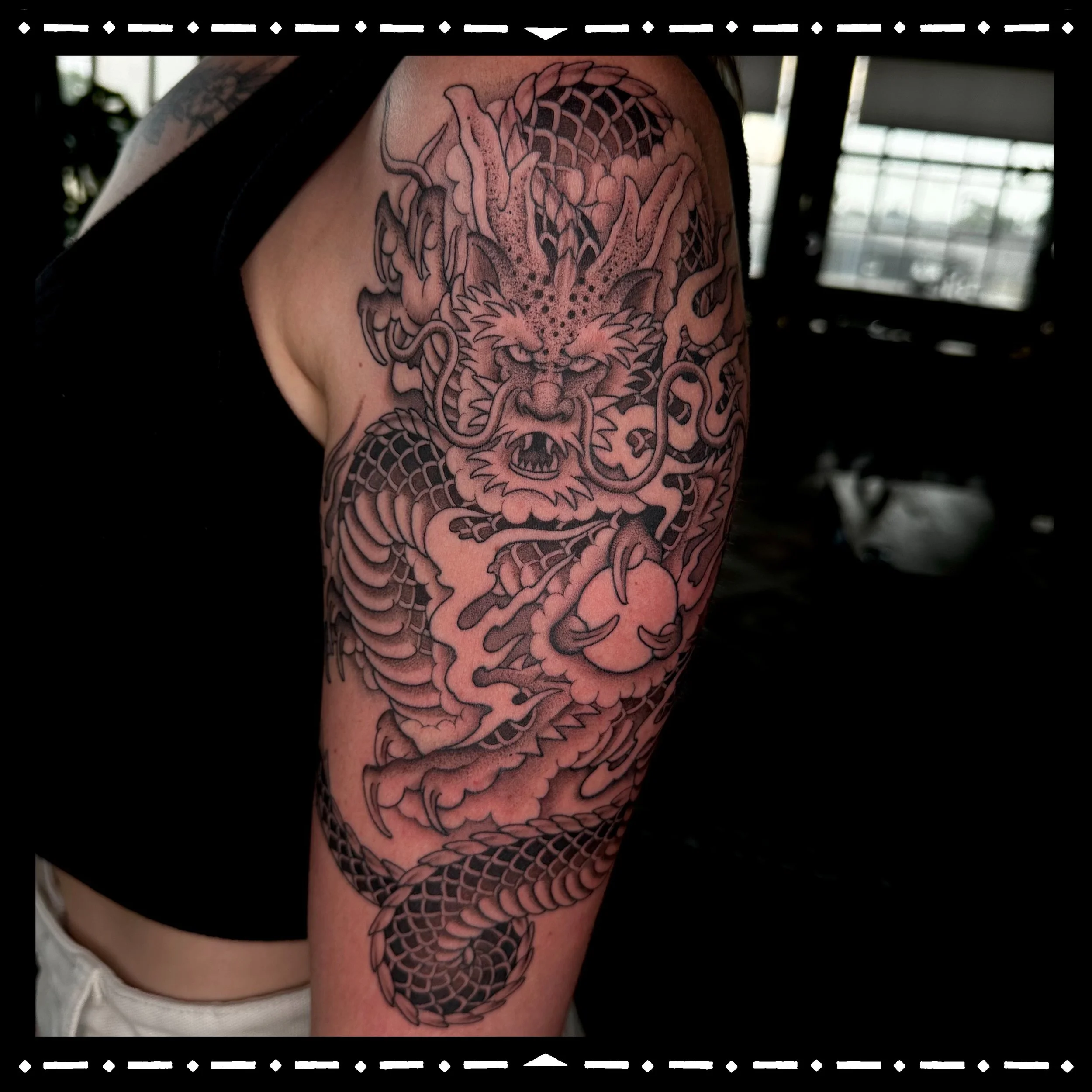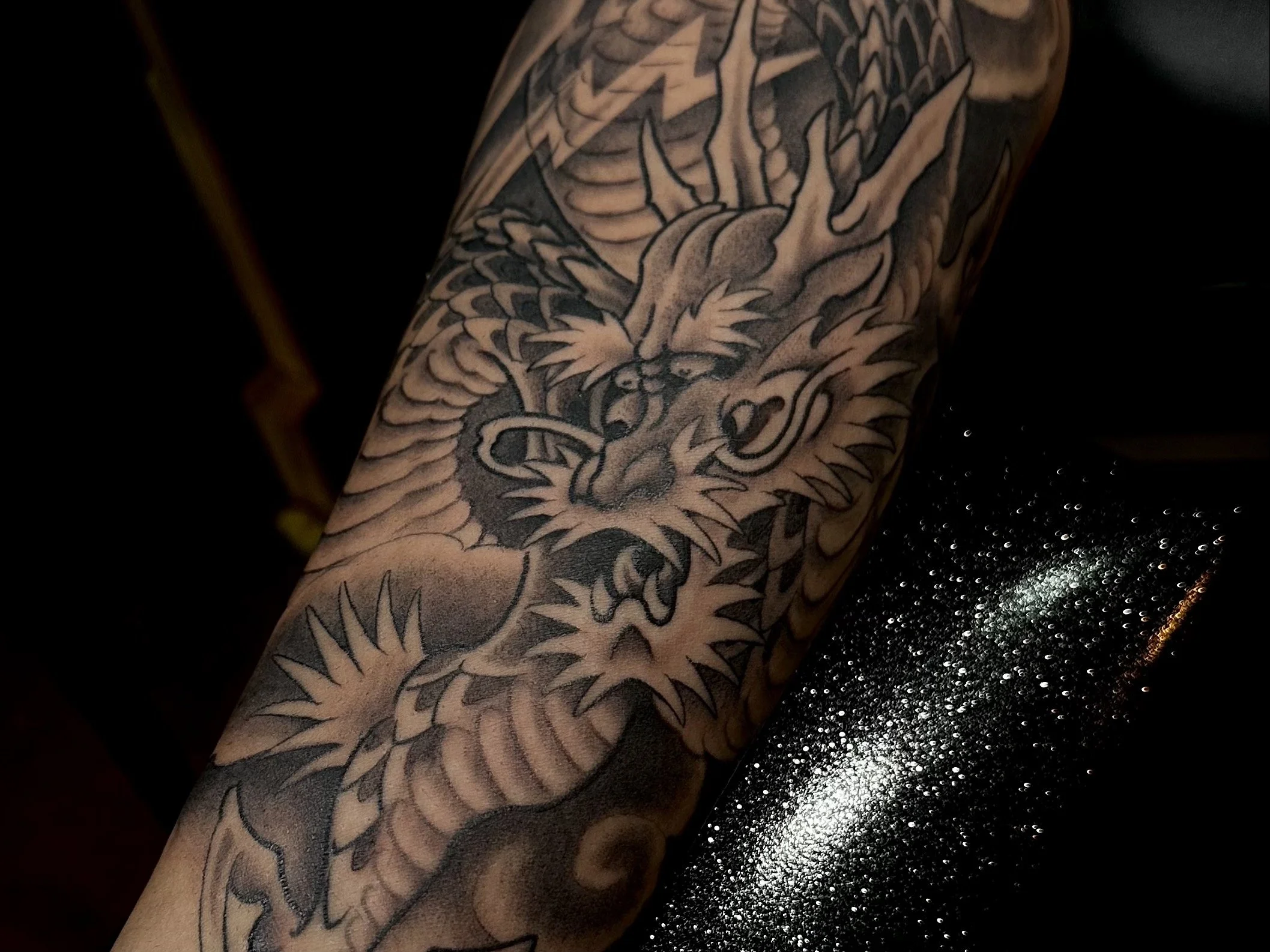 Black and grey fine line tattooing, Traditional tattooing Japanese traditional tattooing.
